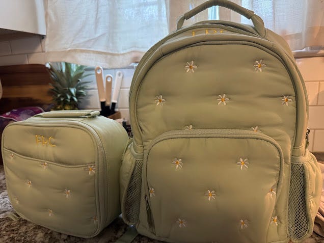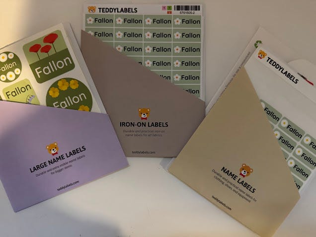 In addition to saving you time, you might save your sanity if you get nearly everything monogrammed or labeled for your child. Fallon has this monogrammed backpack, lunchbox, water bottle and napsack from Pottery Barn Kids! Act fast, because it looks like this set was a limited edition and some parts of the collection are already out of stock. (Pro Tip: when customizing large items like backpacks—stick with initials instead of their full name for safety.) In addition to that, Maya puts these sticker labels on everything as well. They don’t come off in the dishwasher or in the laundry. She has iron on labels for clothing, labels in the bottoms of her shoes and basically on anything that could accidently get left behind or switched around at school.
