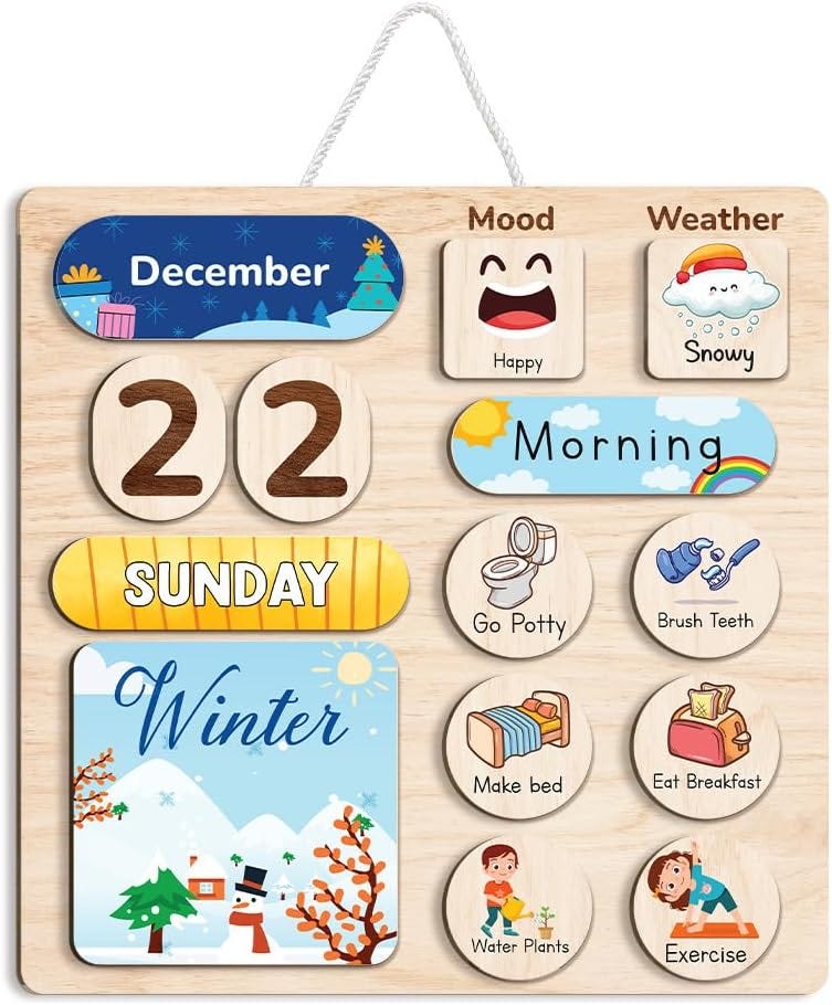 Maya uses this Montessori-style daily calendar and routine board with her daughter, Fallon, and it’s such a game-changer. It helps her visualize the days, learn about dates and weather, and feel included in the family rhythm. Plus, it cuts down on the endless “What day is it?” or “Do I have school tomorrow?” questions.