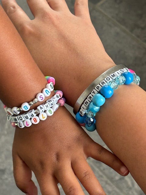 You also heard us mention Maya’s friend, Libby on this week’s episode! Not only for her female fantasy football league, but also for this absolutely genius idea of personalized bracelets for her kindergartener. She made one with both her bus and lunch number to help her girl through the day! We will absolutely be stealing this one in the future!